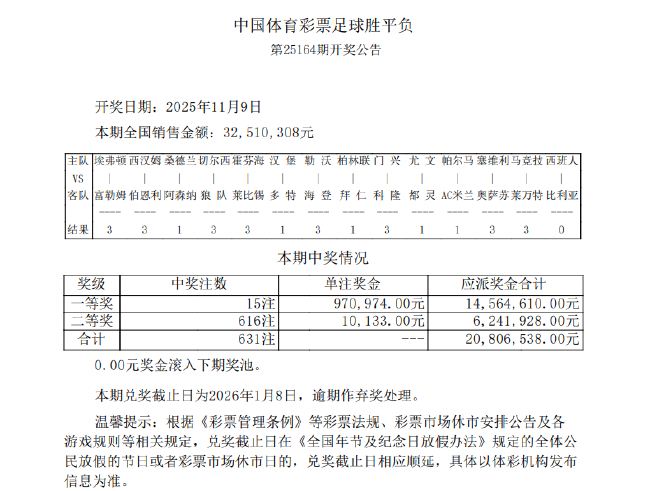 柏林联合2-2拜仁打出6.7倍冷门赛果北京时间11月9日,胜负彩第25164期开奖结果揭晓。本期胜负彩一等奖开出15注,单注奖金970,974元;二等奖开出616注,单注奖金10,133元;任九场开出 telegram官网
